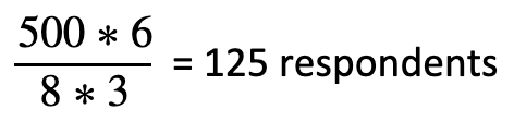 As an example, imagine a CBC experiment involving 3 attributes. The first attribute has 3 levels, the second attribute has 6 levels, and the third attribute has 4. In this experiment we plan to show 3 CBC concepts in each choice task, and we will ask each respondent to complete 8 choice tasks in total. Our back-of-the-envelope formula suggests that a minimum sample size would be about: