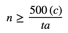 You haveplannedaheadthis time around, padded your prep time, and allowed an entire 30 seconds to calculate your required sample size before you need to get that bid out the door. Need the fastest formula possible? In that case, follow our second rule-of-thumb for sample size: ensure at least 500 appearances per level. The idea here is that across your entire sample of respondents, every attribute level should appear a minimum of 500 times. This calculation requires that you know or decide how many tasks (sets) you plan to include in the exercise, how many concepts (cards) will be shown in each task, and which attribute has the greatest number of levels. Once you have those figures, plug them into this formula for a quick answer: